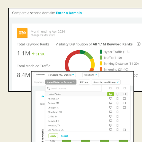 Track search engine rankings across thousands of search engines, languages, and locations on desktop and mobile devices for unmatched visibility into your brand’s digital presence. Plus, dig deep with advanced customization, analysis, and depth of data.