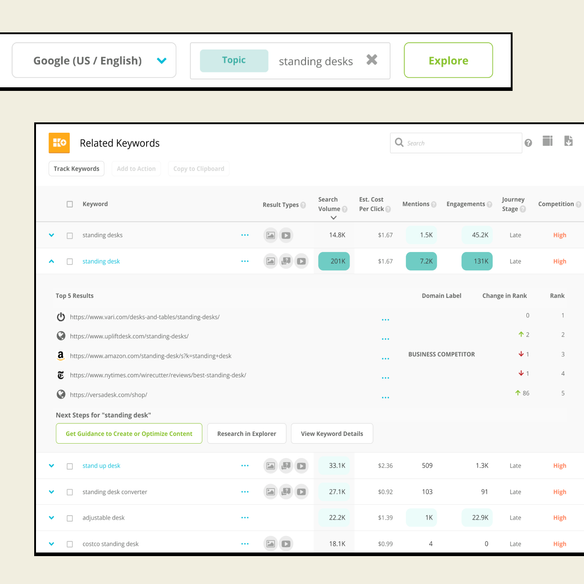 Access the industry’s largest and most accurate global keyword index—including key metrics like monthly search volume (MSV), competition score, pay-per-click (PPC), buyer journey stage, and more—to identify customer needs and content topics that will rank in search engines.