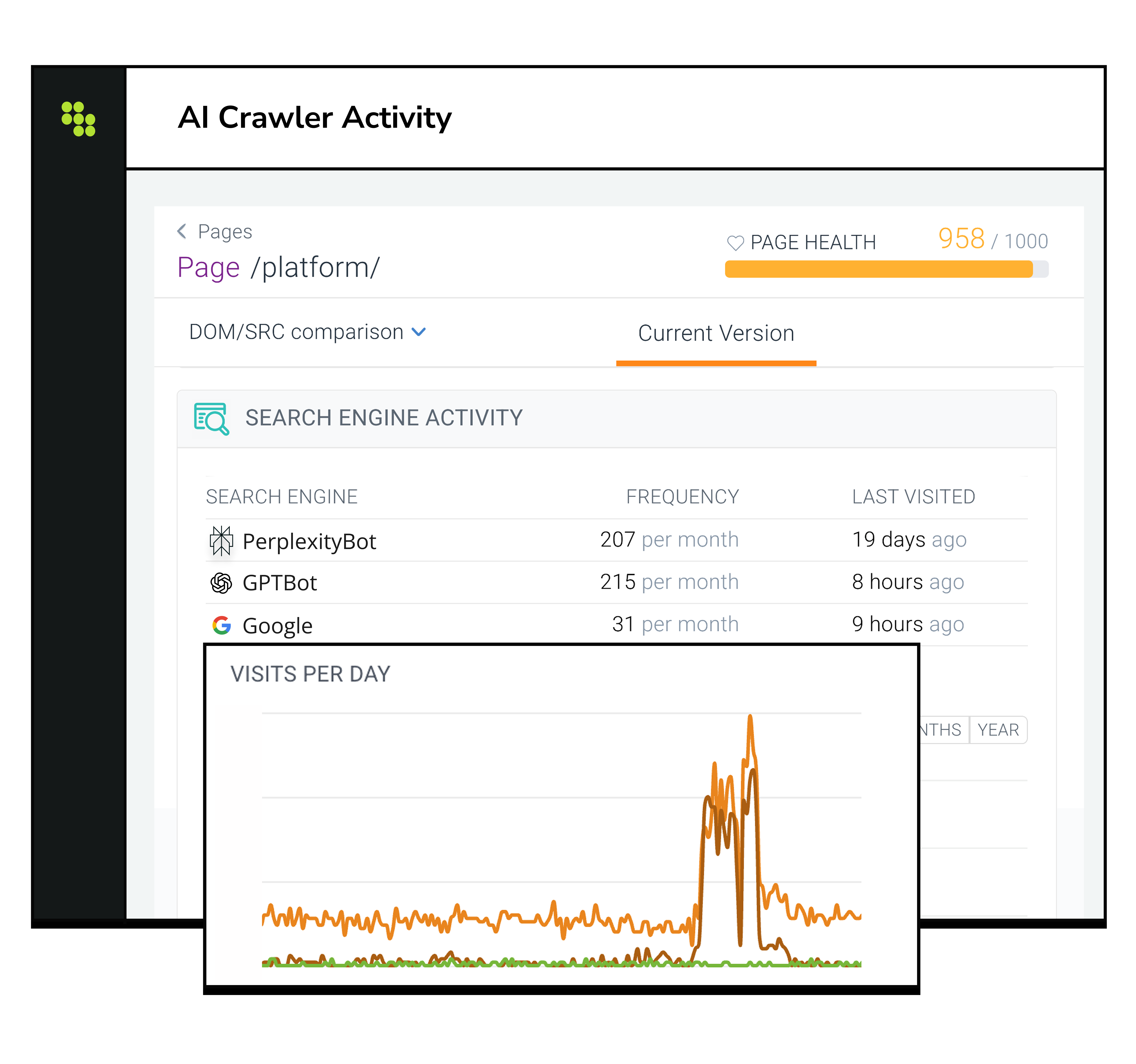 Pinpoint which crucial pages AI bots are accessing, how often, and identify any barriers to discovery. Establish your brand as a credible source for AI language models and generative answer engines.