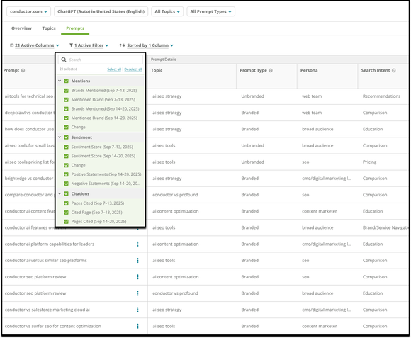 It starts with our intelligent prompt generation. Unlike tools that rely on generic AI approximations, Conductor leverages over a decade of industry-leading keyword data to inform our topic and prompt suggestions. This ensures your AEO strategy is grounded in proven search demand from the start, not just an approximation.