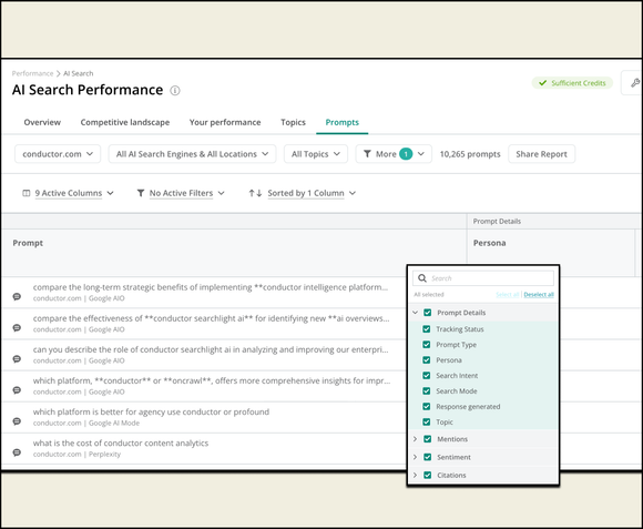 It starts with our intelligent prompt generation. Unlike tools that rely on generic AI approximations, Conductor leverages over a decade of industry-leading keyword data to inform our topic and prompt suggestions, along with tailoring to your personas and intents. This ensures your AEO strategy is grounded in proven search demand from the start.