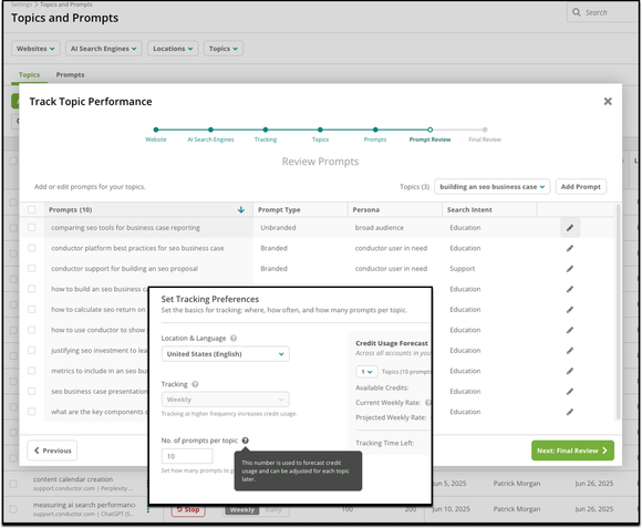 - Add and Refine Your Topics and Prompts: While Conductor's AI can suggest topics, you have full control to add your own niche topics or manually upload a list of specific prompts you want to monitor, giving you total control over the scope of your analysis.