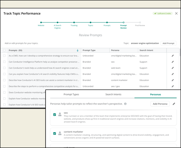 - Configure Prompts by Persona & Intent: This is where the magic happens. Select or build custom audience personas (e.g., "CMO", "Web Team") and map them to specific search intents (e.g., "Comparison", "Pricing"). Our engine automatically generates hundreds of highly-targeted, realistic prompts that mirror how your exact buyers use AI.