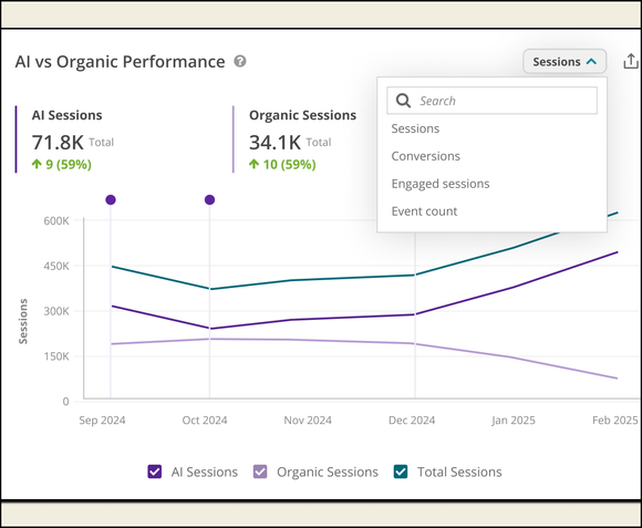 Conductor is the only platform that breaks open this black box. By integrating directly with your web analytics (like Google Analytics 4), we provide a complete, unified view of your AI-driven performance. We don't separate traffic from conversions; we show you the entire customer journey, from initial AI visibility to final business outcome. This allows you to analyze the full spectrum of performance metrics—sessions, engagement, conversions, and revenue—all in one place.