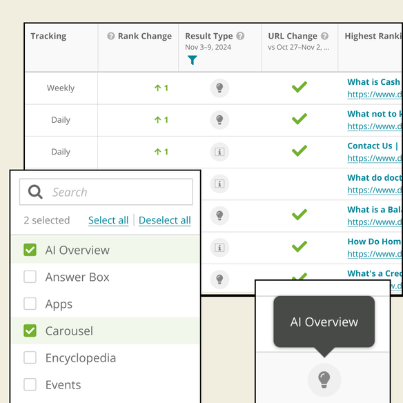 Learn which keywords generate AI Overviews and other result types, and whether you or your competitors are winning them.
